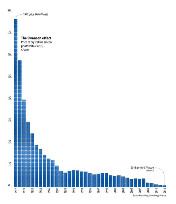 In an earlier blog I discussed Ray Kurzweil’s prediction that in the next 15 years solar will be the dominant form of energy. Perhaps the government has some foresight and sees that the price of solar panels is dropping by roughly half every few years, while the performance steadily increases. This phenomenon has been termed ‘Swanson’s law’ and the chart below describes the trend.