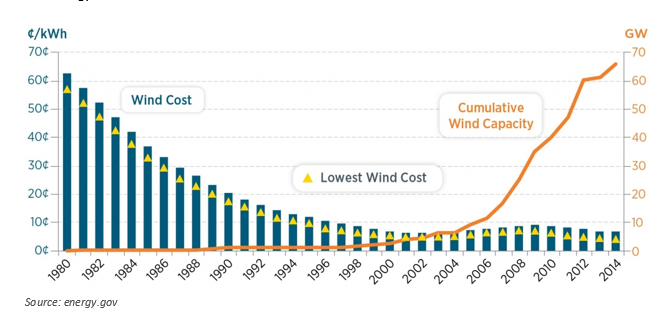 What about wind power? Alberta is a fairly windy place, if we are going down this path of 30% renewables it would make sense to have a blend of solar, wind and other renewables. Below is a chart of the trends in wind power costs. As you can see costs have fallen steadily, but the rate of decrease is smaller in recent years and costs actually went up from 2004 to 2009. Wind turbines are large physical objects that are limited in how cheap they can get by the cost of the materials and labour that it takes to make them and move them around. It appears that in recent years, wind turbine manufacturers are bumping up against this limit and struggling to reduce costs and increase efficiencies above the current technology.