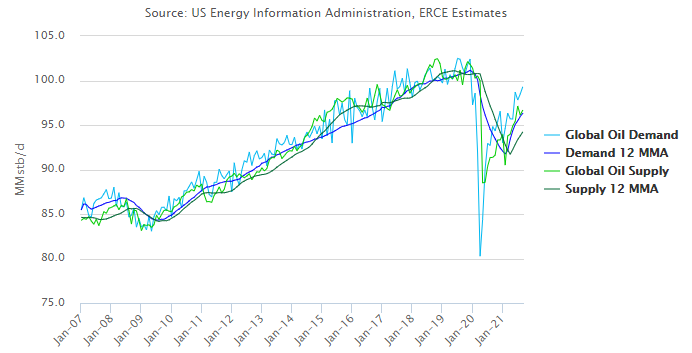 Global oil demand vs global oil supply — million stock tank barrels/day