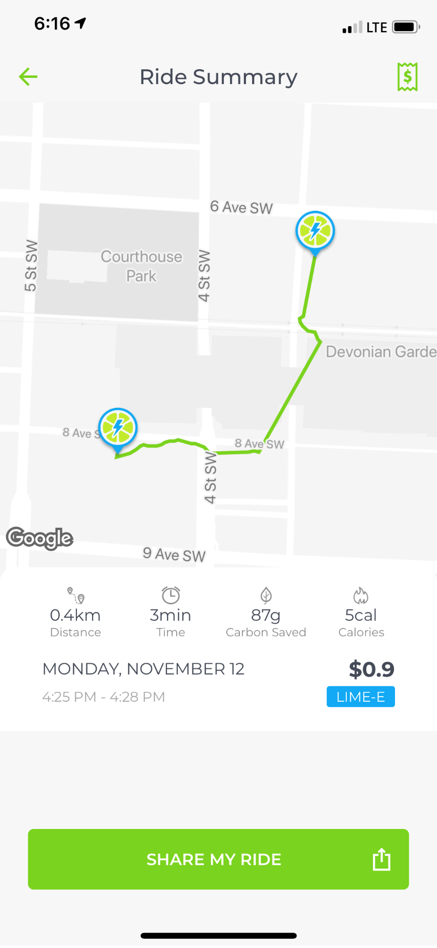 The Lime bikes in Calgary cost $1 to start a ride and $0.30 per minute afterwards. My first short ride across downtown cost me $1.90 minus a $1 discount for my first ride, working out to $0.90. The same distance to walk would have taken about 10-12 minutes, but only took 3 minutes on the Lime e-Bike, and about half of this time was waiting for traffic lights to change. Taking a taxi would have cost $3.80 just to start the meter plus the distance traveled and a customary tip to the driver.