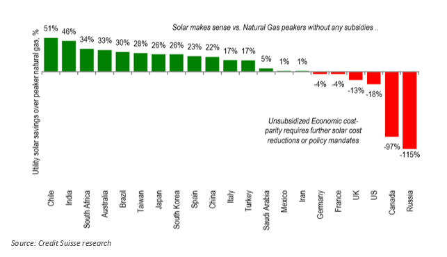 The chart below from Credit Suisse research shows that a solar power project in Canada are roughly twice as expensive as a natural gas turbine, when used for peaking power. (The chart below shows that solar power in Canada is 97% less cost competitive than natural gas). The chart is a function of both natural gas input costs and available sunshine. Canada and Russia fall on the far end of the chart with northern winter climates and cheap abundant natural gas. Even markets like Saudi Arabia fall on the economic side of the chart for solar. Although Saudi has abundant natural gas, they also have cheaper and more abundant sunshine.