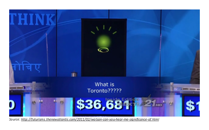 Even though the Watson program was triumphant, it still came up with some goofy answers at times. One famous glitch was when asked a question in the category of ‘US Cities’ Watson came up with the answer of ‘What is Toronto?’. While to any North American with even a basic knowledge of geography this is obviously an incorrect answer, as Toronto is clearly not a major US city. (To be fair to Watson, there are actually a half dozen towns and villages in the US named Toronto, but the largest is Toronto, Ohio with a population of around 5000 people and clearly not a major economic centre.)