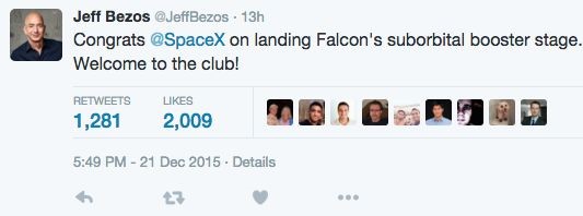 The launch also prompted some interesting social media taunting between the two technology moguls involved in two of the competing space companies. Jeff Bezos of Amazon fame turned to his twitter followers to offer some back-handed congratulations to Elon Musk, the CEO of SpaceX (and Tesla). Bezos’ rocket company, called Blue Origin, had accomplished a similar landing with their smaller rocket a month earlier and drew similar taunts from Musk.