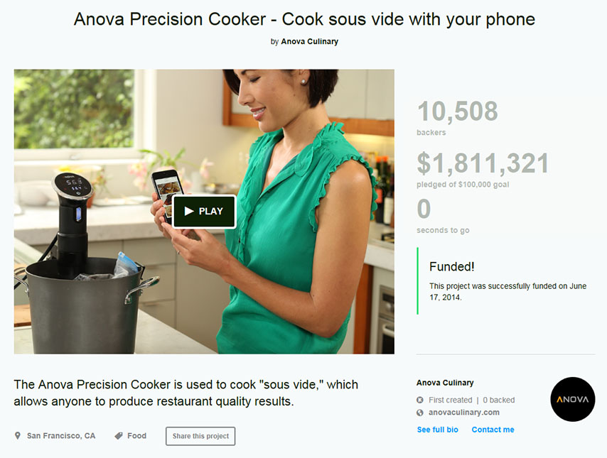 On June 17th, 2014, Anova’s Kickstarter campaign closed at just over $1.8 million and the company was funded and on their way. In their case, they were able to raise a significant amount of non-dilutive capital to start their business. A few months later they had successfully launched their product from design, manufacturing, and eventually to online sales. I ordered one online and had it under my tree as a gift to my wife in time for Christmas (admittedly, it was as much a gadget for me to play with as a gift for her, but I’m sure that she’s figured that out already).